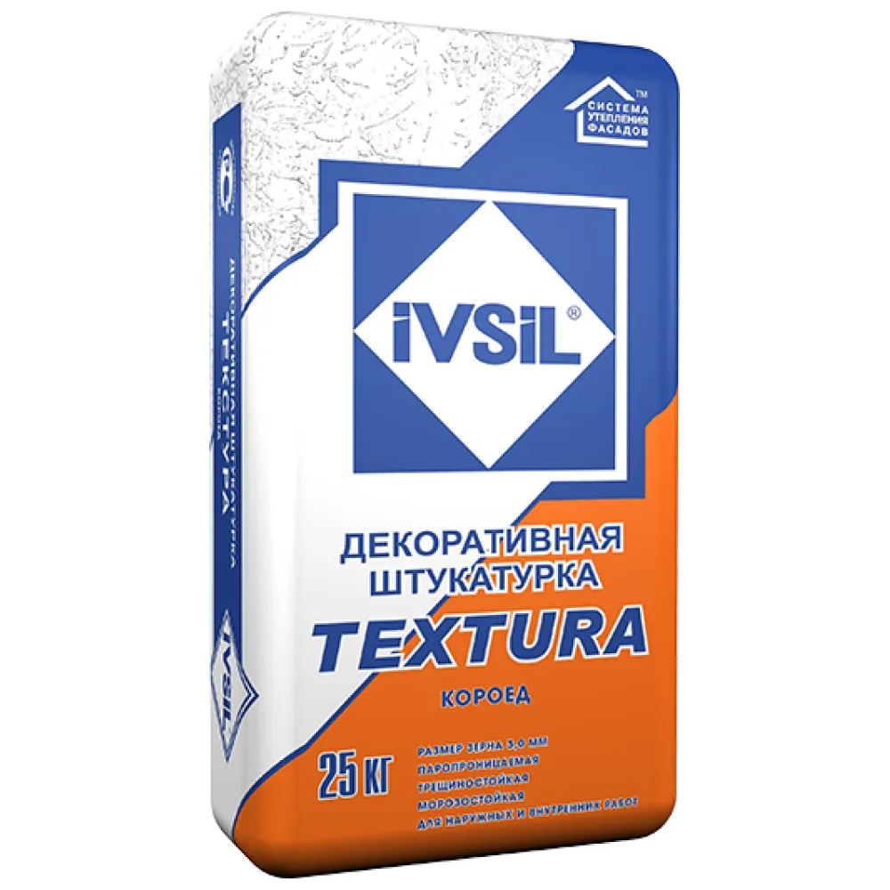 Декоративная штукатурка Короед серии IVSIL TEXTURA изготовлена с использованием белого высококачественного цемента, импортных полимерных добавок и специального наполнителя.