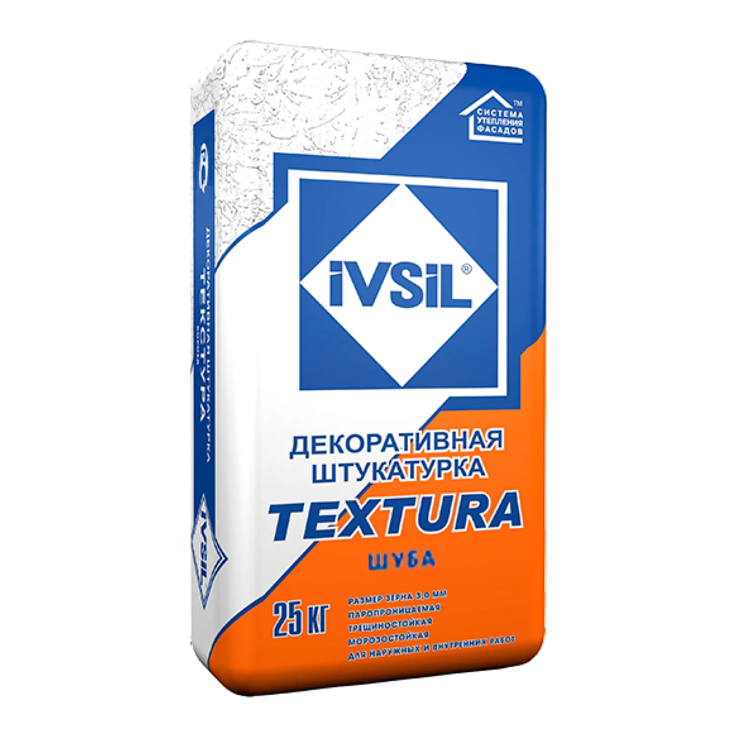 Декоративная штукатурка Шуба серии IVSIL TEXTURA изготовлена с использованием белого высококачественного цемента, импортных полимерных добавок и специального наполнителя.