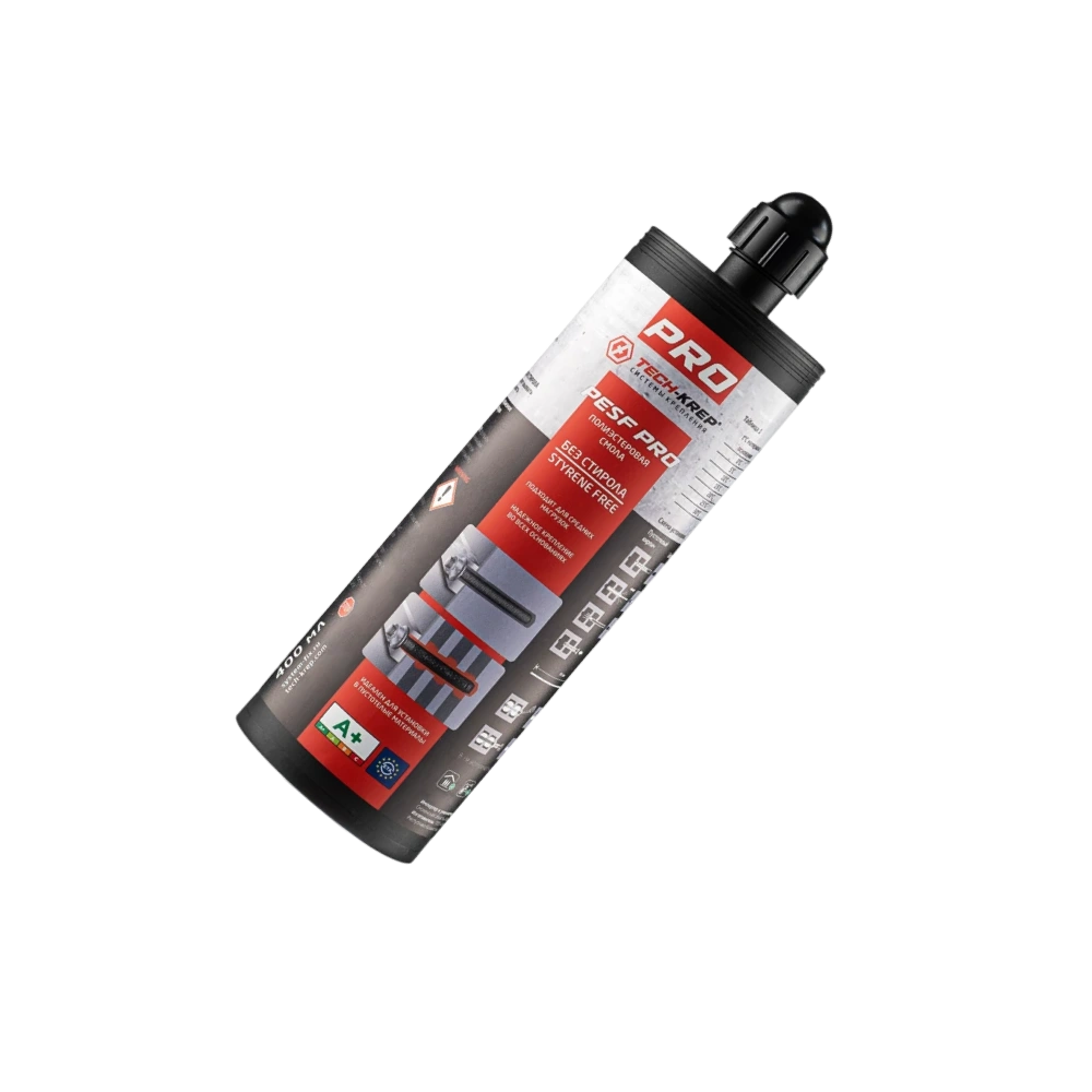 Двухкомпонентный химический анкер бренда TECH-KREP объёмом 400 мл. Состав на основе синтетической быстротвердеющей полиэстерной смолы, не содержит стирол и не имеет запаха.