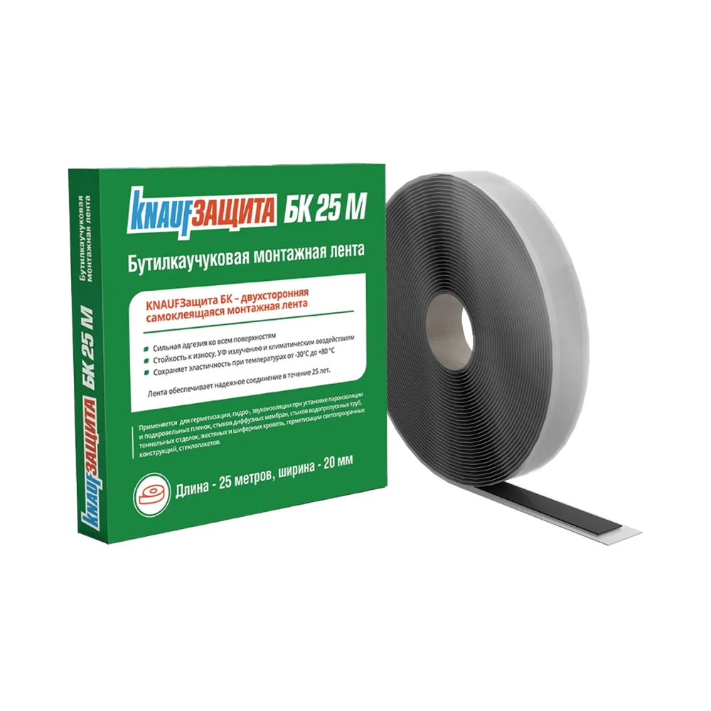 - Надежное склеивание стыков ветрозащитных, влагозащитных, гидроизоляционных и пароизоляционных материалов КНАУФ Защита