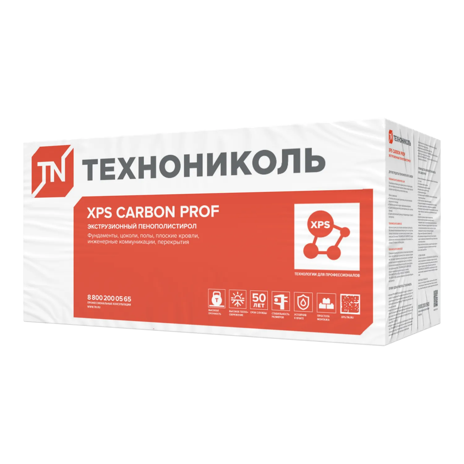 Срок службы плит из экструдированного пенополистирола — не менее 50 лет. Долговечность подтверждена НИИСФ РААСН. Введение в состав экструзионного пенополистирола частиц графита позволяет плитам XPS ТЕХНОНИКОЛЬ CARBON PROF сохранять стабильно высокие характеристики во время всего срока службы. Постоянный контроль качества гарантирует соответствие материала заявленным характеристикам, а также четкое соблюдение геометрических размеров плит.